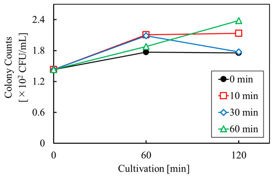 One milliliter of E. coli suspension was mixed with 9 mL of each UFB solution and statically cultured for 120 min at 25 °C (WB–205QM, WakenBtech Co., Ltd., Kyoto, Japan). The pH was maintained neutral and the bubbling time was varied as 0, 10, 30, and 60 min. At 0 min (i.e., before cultivation), one milliliter of the E. coli suspension in solution was extracted for obtaining the initial colony count. Colony counts were then measured at 60-min intervals by inoculating 1 mL of the mixture in the colony counter. Prior to each inoculation, the suspension was diluted to 1 × 10−8.