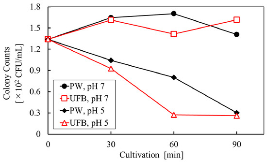 Figure 4 plots the colony counts as functions of cultivation time in E. coli suspensions with different pH values. Over time, the number of colonies decreased only in the acidic solutions. More specifically, the colony counts in the acidic UFB solutions significantly declined during the first 60 min. Colonies with UFB decreased by 12% at a cultivation time of 30 min and by 66% at 60 min compared to the without-UFB case. In contrast, the colony counts in the alkaline solutions (pH = 9) exceeded the detectable limit of the colony counter and were therefore excluded from Figure 4.