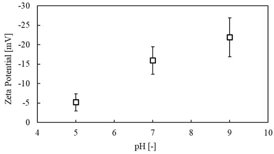 The high shrinkage rate increases the surface electrical charge per unit area and increases the negative zeta potential on MBs [3]. As shown in Figure 6, the UFBs insignificantly affected the negative zeta potential in acidic solutions. It was estimated that the UFBs did not significantly shrink, so the negative zeta potential did not increase. In fact, the negative zeta potential was reduced by absorption of H+ ions.