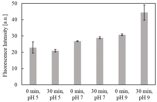 Figure 7 compares the fluorescence intensities of the solutions after reacting with the fluorescence reagent, APF, as a proxy of ∙OH detection. In the solutions with and without bubbles (bubbling time 30 and 0 min, respectively), the fluorescence intensity tended to increase with pH. The alkaline solutions exhibited the highest and second–highest fluorescence intensities, and the acidic solutions exhibited the lowest and second–lowest fluorescence intensities. Moreover, the intensities were similar in the acid and neutral solutions with and without UFBs, but were higher in the alkaline UFB solution than in the alkaline solution without UFBs. These results suggest higher ∙OH content in alkaline solutions than in acidic solutions. These results contradict the expected result, namely, that UFBs exert a sterilizing effect in acidic solution.