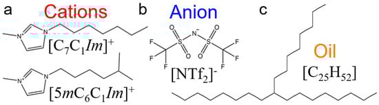 Chemical structures of (a) linear 1-heptyl-3-methylimidazolium and branched 1-(5-methylhexyl)-3-methylimidazolium cations (red), (b) bis[(trifluoroethane)sulfonyl]imide anion (blue), and (c) 9-octylheptadecane oil (orange) molecules. The assigned colors to the molecules remain the same throughout this study.