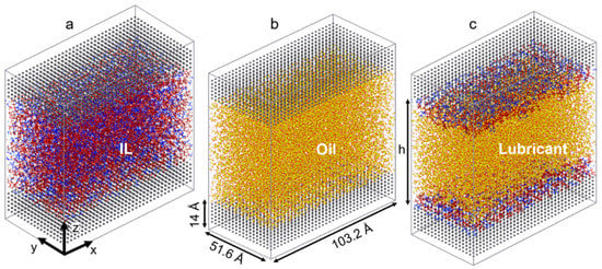 The ILs chosen for this study consist of two imidazolium-based cations with long linear and branched alkyl chains (1-heptyl-3-methylimidazolium [C7C1Im]+ and 1-(5-methylhexyl)-3-methylimidazolium [5mC6C1Im]+), each coupled with an oxidatively stable anion (bis[(trifluoroethane)sulfonyl]imide [NTf2]−). As a model oil with a low friction coefficient, a branched alkane (9-octylheptadecane [C25H52]) is used to simulate pure conventional fuel behavior. The chemical structures of the molecules studied are shown in Figure 1. The liquids are confined between two identical surfaces, each made of 6480 α-iron (Fe) atoms [61]. The area of the solid-liquid interface is 5325 Å, and the height of the metal slab is 14 Å (roughly the thickness of 10 atomic layers). Four different confined systems are studied: IL with linear alkyl chain cation (linear IL), IL with branched alkyl cation (branched IL), 9-octylheptadecane, and a mixture of linear IL and oil (i.e., lubricant). Both the linear and branched ILs-Fe systems size is 51,180 atoms while the oil-Fe is 63,472 atoms. The target fraction of ILs in oil is calculated based on the number of ion pairs required to fully cover the metal surfaces. The mixed system is created by placing the IL with linear cation directly on the upper and lower interfaces and filling up the bulk with oil molecules (see Figure 2c). Here, the system size is 65,376 atoms, out of which 11,760 are IL atoms.