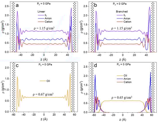 In Figure 4, the density profiles along confinement direction z for the unpressurized case are shown for all four liquids. The introduction of the metal surfaces with no external forces acting on the system gives rise to multilayer formation at both lower and upper walls. This is in agreement with IL behavior reported in previous studies [60]. This type of restructuring is due to the interaction between the liquid and solid atoms of the surface [11]. In the case of linear and branched ILs (Figure 4a,b), the first interfacial layer is mainly populated by anions, but some cations are present at the surface as well. The second layer mainly consists of cations. Due to the symmetric nature of the [NTf2]− anion, it arranges tightly on the surface.