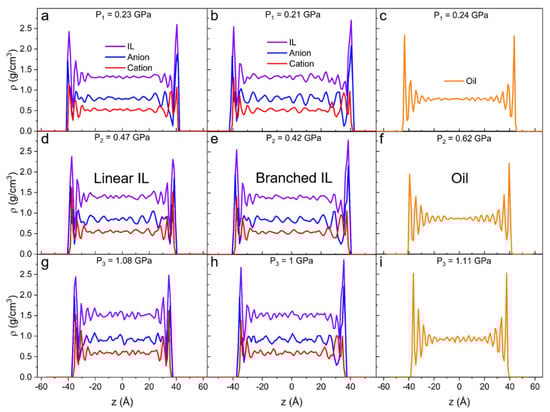 Density profiles along confinement direction (z) for (a,d,g) linear IL, (b,e,h) branched IL, and (c,f,i) 9-octylheptadecane with external pressure of (a–c) P1 ≈ 0.2 GPa, (d–f) P2 ≈ 0.5 GPa, and (g–i) P3 ≈ 1 GPa applied to the walls. The number of layers increases as more pressure is applied to the systems.