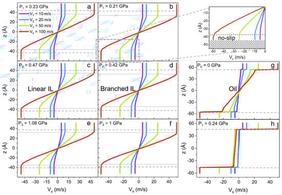 Velocity profiles (Vx), as a function of the z-coordinate of linear and branched ILs, are plotted in Figure 7a–f. Four different velocities are applied to the metal walls to access the liquid response over a range of shear rates. The data reveal no-slip boundary conditions at the solid-liquid interface for ILs. However, even though the velocity profiles seem to follow linear Couette flow behavior, this is only true for the bulk of the liquids. The phenomenon is called central localization (a specific case of shear banding) when interfacial layers of liquid move with the solid walls as if these layers are a continuation of it [93,94,95,96]. Hence, the no-slip condition is extended to the ordered ion structures present on the surface. This phenomenon of central localization is observed due to the high stability of the IL layer on the surface, even under nano-confinement and high share rate conditions [97,98,99,100].