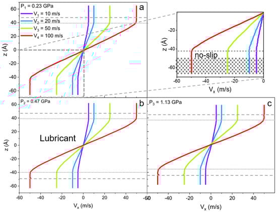 Velocity profiles along confinement direction (z) for the lubricant (mixture of linear IL and 9-octylheptadecane oil) with the applied external pressure of (a) P1 = 0.23 GPa, (b) P2 = 0.47 GPa, and (c) P3 = 1.13 GPa. The inset of the (a) at pressure P1 is a magnification of the ionic layer with the no-slip boundary condition. The gray dashed line shows the solid-liquid interface, and the dotted line indicates the no-slip boundary within the ionic layer. The addition of IL fully reduces the slip of oil.
