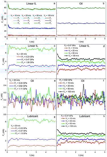 The next step is to verify whether using ILs additives to conventional lubricants can lead to a friction reduction in the system. In Figure 9a,b, as anticipated, the normal forces (Fn) exerted by the walls on the liquid depend on the pressure applied and are independent of the velocity. On the other hand, the shear forces (Fs) for ILs and lubricant systems (Figure 9c,d,g,h) show dependency on both velocity and pressure. The data for oil are highly noisy, and after averaging it over time, a weak velocity dependence but strong pressure dependence is detected. Both normal and shear forces for all systems reach constant values over the simulation run time.
