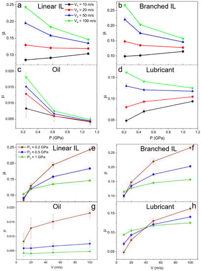 Friction coefficient as a function of (a–d) pressure and (e–h) velocity for (a,e) linear IL, (b,f) branched IL, (c,g) 9-octylheptadecane, and (d,h) lubricant systems. The friction coefficients of IL-containing systems decrease with applied pressure at high shear rates.