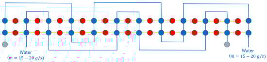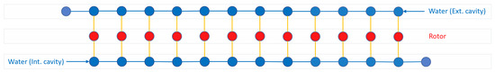 A second set of simulations was performed using a more detailed network. This second network included additional solid nodes that modelled the two stators. The fluid nodes of one circuit were so able to exchange heat not only with fluid nodes of the other circuit, but also with fluid nodes of the same circuit. Only Equation (4) has been used for the stators, as de Beer et al. [15] highlighted that the transition to turbulent flow for the stators occurred at much lower Reynolds numbers than for the rotor. A schematic of the updated network is reported below in Figure 3: