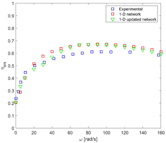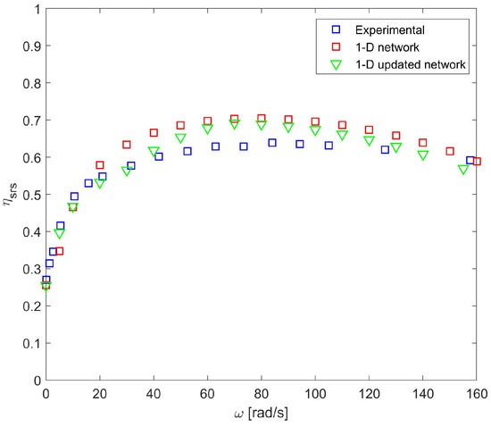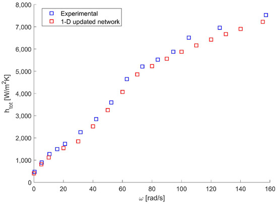 The differences between the results using the two different networks are most evident for low values of , where the simulations using the updated network shows better agreement with the experimental data and predicts lower values of heat exchange effectiveness. The inclusion of the stators inside the network leads to a lower mean temperature differential between the circuits, so reducing the heat exchanged. The difference between the two networks becomes negligible for higher values of for two reasons: