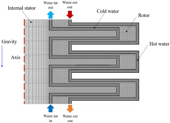 The results reported in this paper were obtained with the commercial software ANSYS Fluent 2019R3. The test case was modelled as a 2D problem thanks to the axisymmetric nature of the geometry and the steady-state assumption. The computational grid was generated in ICEM-CFD and is reported in Figure 7. As it is possible to notice, the single-phase cases consist of a Conjugate Heat Transfer (CHT) including the internal stator and the rotor. “Cold” water flows from bottom to top, while “hot” water enters the upper part in a counter-flow arrangement. The fluid–solid interfaces between such domains are coupled, meaning that the same temperature is achieved on the two sides and the heat is conserved through the interface (, ). The other sides of the solid domains, as well as the surface of the “hot” water in contact with the external stator, are considered adiabatic.