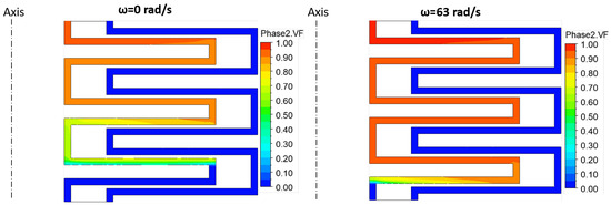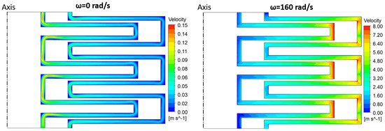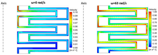 The results of the CFD simulations for the single-phase conditions are reported in this section. The first results reported consist of the velocity fields, under stationary and rotating conditions (see Figure 8). As it is possible to observe, on equal mass flow rate the rotation has a strong impact on the flow conditions. As highlighted also by de Beer et al. [18], the rotational speed of 160 rad/s is sufficient to bring the flow from laminar to fully turbulent conditions in terms of rotational Reynolds number. This is also confirmed qualitatively by the velocity contours. Under laminar conditions, the flow is prone to separation downstream of curves and is characterized by a reduction in velocity when moving to high radii (due to the increase in passage section). On the contrary, when dealing with rotational conditions, the flow exhibits a stronger uniformity due to strong wall shear, which also indicates stronger gradients and ultimately higher transfer levels. It is also worth pointing out that the velocity gradually increases, moving to higher radii due to the increase in tangential velocity.