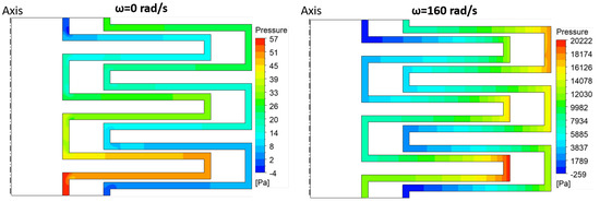 Static pressure fields predicted by CFD: 0 rad/s (left) and 160 rad/s (right).