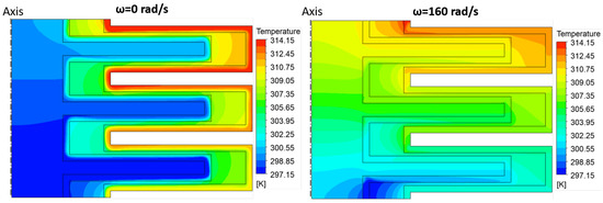 Temperature profiles predicted by CFD at the center of the fluid channel and the fluid–solid interface: 0 rad/s (left) and 160 rad/s (right).