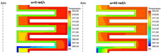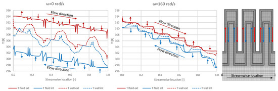 To obtain a more quantitative insight into the results, temperature profiles were extracted and plotted in Figure 11, considering the center of the fluid channels (continuous lines) and the fluid–solid interface (dashed lines). The data were arranged to evaluate the streamwise location (the curvilinear abscissa) in non-dimensional terms, 0 being the entrance of the “hot” water and 1 the exit. By doing so, it is possible to appreciate the impact of rotation. Under stationary conditions, the average local temperature difference is about 2 K for the rotor and about 12 K for the fluid. Rotation reduces the temperature difference of the fluid by a factor of 6, with the fluid temperature closely approaching the wall temperature thanks to the increased mass/thermal transport.