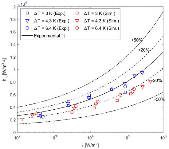 It is possible to see that the heat transfer coefficients predicted using Equations (8) and (9) are reasonably close to their experimental counterparts, although the 1D model consistently underpredicts the average heat transfer coefficient.