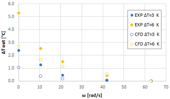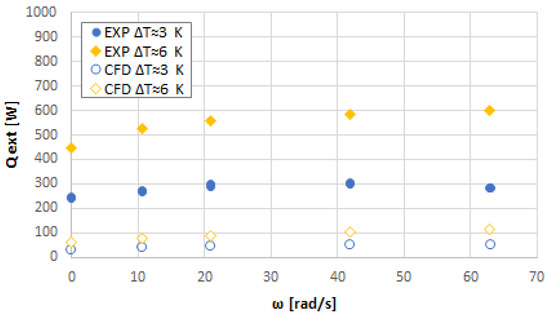 It is possible to see that the heat exchange effectiveness predicted by the simulations and the one measured experimentally show similar trends when reported as a function of the rotor’s rotational speed. There is a sharp increase in heat exchange effectiveness between 0 and 40 rad/s. However, the gain in terms of heat exchange effectiveness is gradually reduced for higher values of angular velocity, and it even starts to decrease when is higher than 80 rad/s. This is due to the increase in the power dissipated by the rotor, as reported by de Beer et al. [15]. This hampers the cooling of the fluid in the external circuit. At the same time, the fluid wall heat transfer coefficient is so high that the rotor conductive thermal resistance is no longer negligible, with a consequent reduction of the influence of on the heat fluxes between the two circuits.