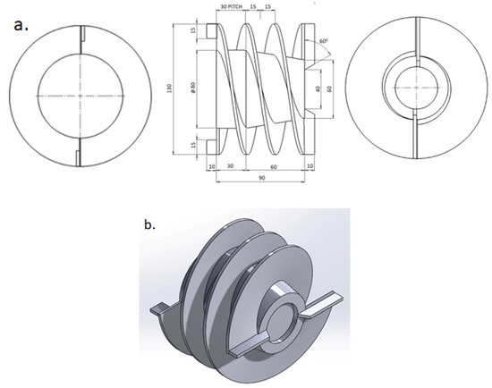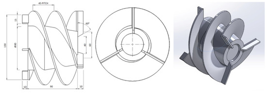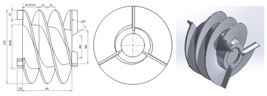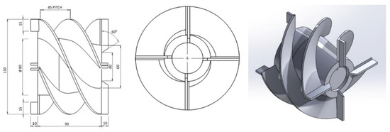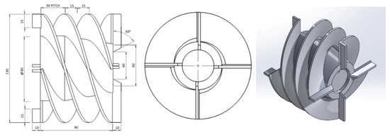 Existing twin start helical rotors contain two blades in the front side of about 45 mm length and two blades at the back side of about 15 mm length. The two flights are attached in between front blades and back blades. Pitch of the flights is 30 mm. All the blades have 3 mm thickness. For better understanding, detailed geometric parameters and isometric view of the twin start helical rotor is shown in Figure 4a,b, respectively.