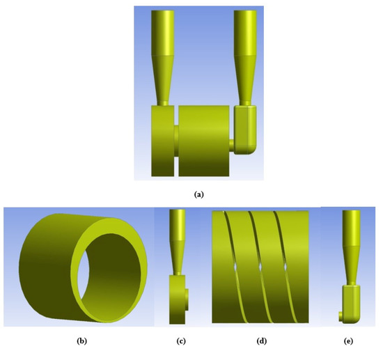 Computational model of (a) whole pump (b) casing (c) discharge chamber with water pipe (d) rotor volume and (e) suction chamber with water pipe.
