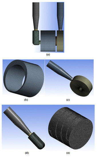 The computational domain of the concerned pump is discretized into a several small parts called elements using the ANSYS meshing tool. To attain the uniformity in the fluid flow, structured meshes were employed to discretize the computational domains of the discharge chamber, water pipes and casing. Taking into consideration the complex structure of the rotor and suction chamber, unstructured meshes were employed for discretisation of their computational domains and to improve flexibility in the fluid flow. Improving the quality of the mesh helps us to reduce the error in the performance prediction. Total number of elements used in CFD analysis was determined by mesh independence checking. It is done by finding the smallest number of elements needed for the CFD analysis without significant difference in numerical result. The computational mesh of the discharge chamber, suction chamber, casing, rotor, and whole pump is shown in Figure 7a–e.