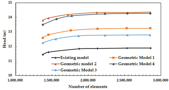 The quality of the computational mesh used is important for more accurate outcomes so mesh independence testing was carried out on the model and an appropriate mesh density was decided. The pump head was calculated for different mesh element cases to verify the mesh independence. The results indicate that with the increase of mesh number, the numerical value of the head shows a steady trend, increasing at first and then changing only slightly with further increase in mesh number and finally the difference between the head values for the last two meshes is below 0.15% i.e., further increasing the mesh numbers will thereafter not have much influence on simulation results, as shown in Figure 8. The total mesh numbers in the existing model and four geometric models of the pump were 2857615, 2854528, 2849827, 2856610, 2854323, separately, so these meshes were used for the further CFD analysis as it is presumed to be capable of predicting accurate results.