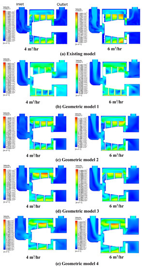 As seen from the previous section, the realizable K-ϵ model was found to be the most appropriate model for simulating the flow characteristic in the pump. Following this, another study on the effect of geometric modification on the pump performance was conducted using the identified appropriate turbulence model (realizable K-ϵ). The CFD analysis simulates the internal flow inside the pump and aids in understanding of more complex phenomena and its evaluation. For better understanding of the flow behaviour, the velocity distribution in the pump at two different flow rates (4 and 6 m3/h) is shown in Figure 16a–e. The asymmetry introduced by the casing and the rotor section of the pump greatly affects the flow in the pump. While it gives a good indication of the flow inside the pump, a strong recirculation zone appears at the rotor and casing close to the rotor exit. The relative velocity was found to be smaller at the eye of the rotor in all cases.