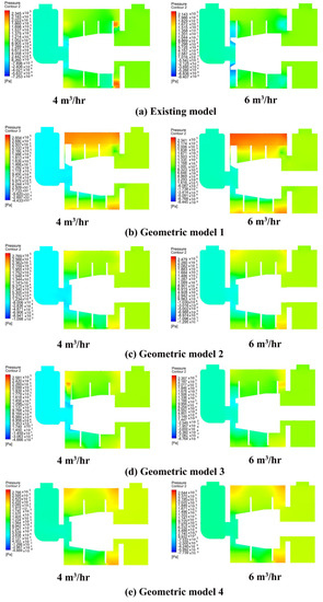 The internal static pressure distribution was calculated in the four different geometric models. Firstly, five different mass flow rates (2, 3, 4, 5 and 6 m3/hr) were simulated with four geometric models. Figure 17a–e depict the static pressure calculated of the four different geometric models under two different flow rate (4 and 6 m3/hr) conditions. The static pressure was found to be lowest at the inlet and highest at the outlet of the pump. It turned out to be greater in the casing section than in the centre of the rotor. When the rotor rotates regularly the casing section always seems to have a high pressure [9] and the lowest pressure was in the eye of the rotor. This is due to the centrifugal force acting on the fluid in between the rotor blades when the rotor starts rotating. This centrifugal force pushes the fluid outwards forming an empty void at the centre of the rotor. This void translates to a low-pressure region at the centre of the rotor that the fluid from the suction chamber tries to balance by quickly flowing into that space. However, this increase of flow considerably decreases the pressure in the rotor section and so a disordered pressure distribution was observed. In all the pump models, an overall increase in static pressure was seen with any increase in the flow rate. For geometric model 3, the lower pressure region extends to a larger area than other three types of the rotors under all flow rate conditions. Under all flow rates, geometric model 2 shows the smallest pressure gradient and smallest lower pressure region compared with other three models, proving that the optimised model 2 is the best. This explains the trend in efficiency as geometrical model 2 (four blades, decreased pitch length and most guided internal flow) with most uniform pressure distribution has the highest efficiency and decreased secondary and mixing losses, whereas geometrical model 1 shows non-uniform pressure distribution and the lowest efficiency of all the improvised geometrical models.