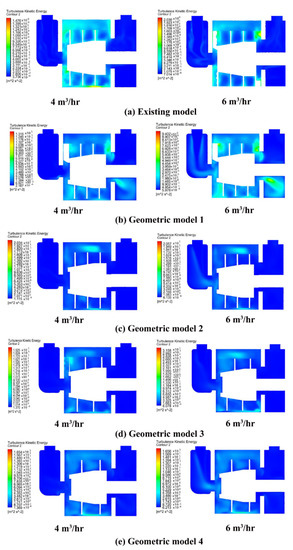 The turbulent kinetic energy distribution is shown in Figure 18a–e. Under low flow rate conditions of 4 m3/h, the scope of the turbulent kinetic energy distribution in geometric model 1 was larger than that of other geometrical models. The velocity had an obvious change when the water flows from the rotor to the casing. The operation of geometric model 1 is not stable. Under a flow rate of 4 m3/h, the turbulent kinetic energy distribution scopes of geometric models 3, and 4 were nearly similar and they were slightly larger than that of geometric model 2. For high flow rate conditions of 6 m3/h, the distribution scope of turbulent kinetic energy was almost similar for geometric models of 2, 3 and 4 and less than geometric model 1. According to the analysis of turbulent kinetic energy, the turbulent intensity of geometric model 2 was less intense than that of other geometric models, so the energy loss of model 2 was less than that of other models, which could ensure the high carrying capacity of this pump.