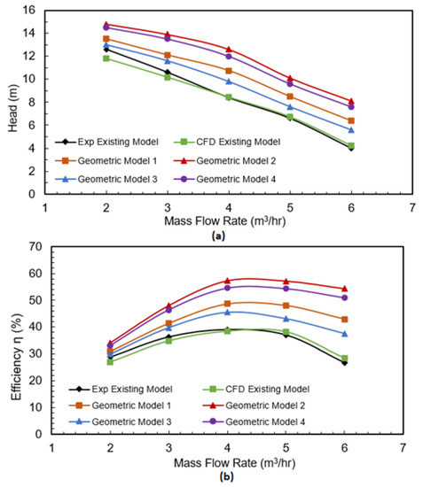 Hydraulic performances of the Liquivac pump with four different geometric models (a) Head-flow rate (b) Efficiency-flow rate.