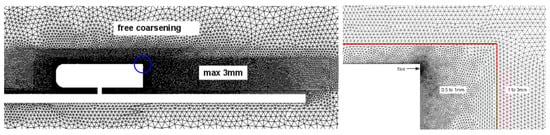 According to Kolmogorov [28], for a Reynolds number of (based on the vehicle height), turbulence scale ranges from m ( with L the Ahmed body width) to wind tunnel height of 2 m. Furthermore, time scales ranges from 10 s () to the total averaging time required for this simulation. This later is about ten times the Ahmed body length over the reference velocity. Hence, 0.3 s averaging time is used. The cutoff wave number depends on discretization such as . With Large Eddy Simulation (LES) methods, discretization has to be fine enough to enable sufficient scale exact resolution. Pope [38] characterized the inertial/dissipative scale limitation assuming that maximum scale length structures are responsible for 90% of dissipation. In this case, it corresponds to 0.84 mm. These considerations lead to a mesh discretization compromise constituted of 120 million unstructured tetrahedral cells mesh illustrated in Figure 2 taking account of CPUs and memory resources [19]. Furthermore, the solver uses an implicit scheme letting to choose quite large time steps corresponding to a 2000 Hz frequency ( s). Simulations are performed on a 1.6 s physical time; as the convergence occurs after 0.6 s, 2000 snapshots are used to analyze the results.
