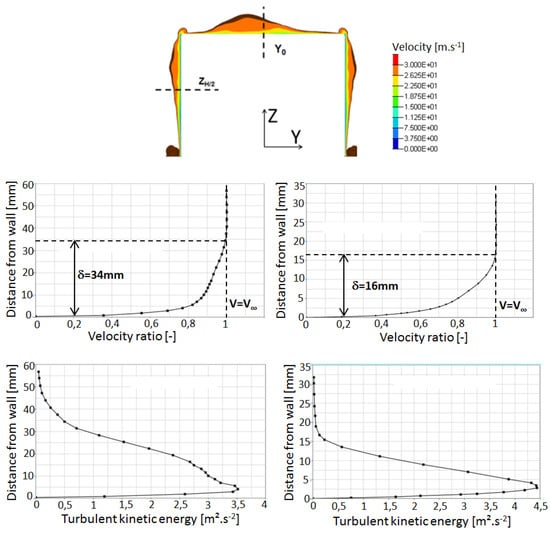 (Top) Velocity profile under the boundary layer in the plane X = −H/10. (Middle) boundary layer thickness on the roof in the Y0 cut plane (left) and on the lateral bluff body at cut plane (right). (Bottom) turbulent kinetic energy profiles on the roof in the Y0 cut plane (left) and on the lateral bluff body at cut plane (right).