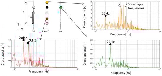 Finally, several monitoring points in the wake vertical symmetry plane are selected to identify dominant flow frequencies and cross correlations as shown in Figure 12: The red point is in the area of lower pressure, the yellow dot captured the upper shear layer behavior and the green dot stand for the recirculation area. Cross spectra of these sensors with the sensor located at the black dot highlight some correlations and the related frequencies. This denotes a coherent mechanism with periodic behavior. For the sensor located in the upper shedding layer (yellow), the low frequency of 20 Hz (St = 0.13) corresponding to the near wake recirculating zone is strong and higher frequencies close to St = 0.6 (100 Hz) fitting to the shear layer fluctuations interaction with the recirculating area are also measured. For the point in the lower part of the time averaged minimum pressure area (red), the frequency of 20 Hz (St = 0.13) is emerging too. We can suppose that this frequency denotes a vertical alternating activity related to a double recirculation zone. Another frequency of 26 Hz (St = 0.17) is dominative in this location as well as for the dot located downstream in the wake (green); this represents the shedding frequency of structures expelled outside the recirculating area in the wake. This behavior is described in [29].