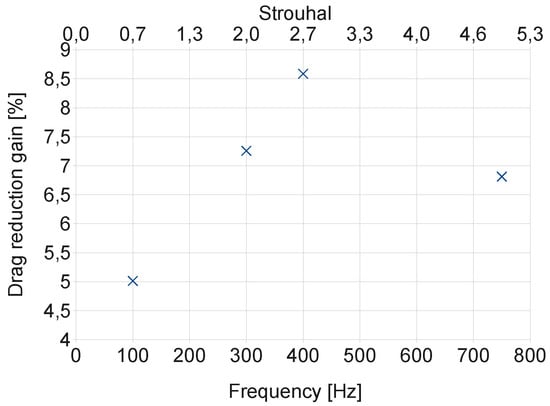 Drag reduction computed as a function of the forcing frequency with synthetic jets, versus the uncontrolled flow. We can notice a gain of at the forcing frequency of 400 Hz, corresponding to .