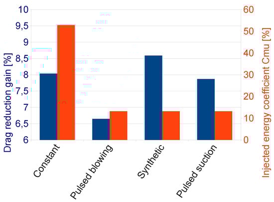 The constant blowing jet appears to be less efficient considering that there is the same amount of drag reduction than other actuation types with a higher energy consumption as seen in Figure 14. Therefore, this case will be discarded for the following study and we will only focus on pulsed and synthetic actuators in the next section.