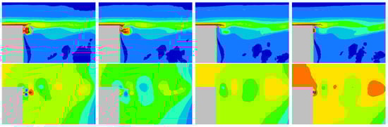Snapshots of the upper shear layer for blowing pulsed jet in the Y0 cut plane from step 1 (left) to step 4 (right): (Top) Vorticity, (Bottom) Pressure.