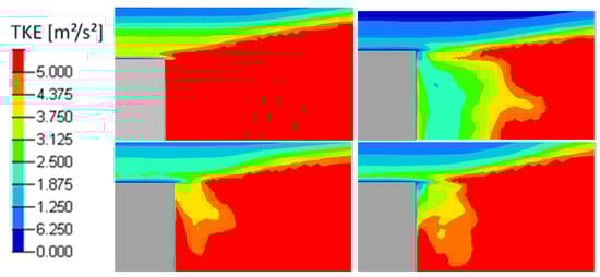 The synthetic jet also decreases the recirculation zone turbulent kinetic energy compared to the reference case even if its effect is less drastic than the pulsed jet.