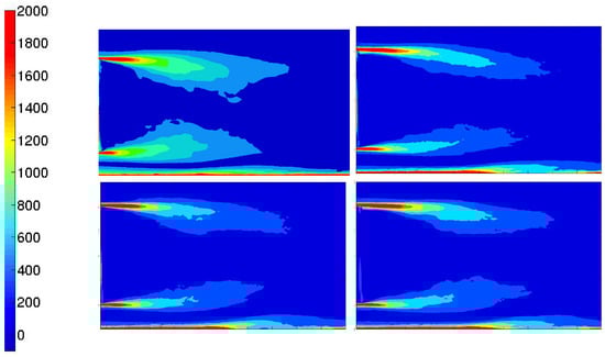RMS values of pressure in the Y0 cut plane: reference case (Top left), pulsed jet (Top right), suction jet (Bottom left) and synthetic jet (Bottom right).