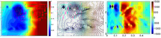 Time-averaged pressure coefficient (Left), adverse pressure gradient and isolines (Centre) and x-component of pressure gradient (Right) for pulsed jet in the Y0 cut plane.