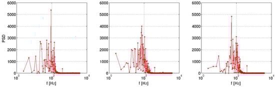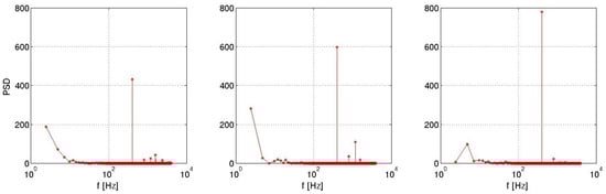 Power spectral density for a probe at x = H/2 from the rear back end for pulsed jet (left), suction jet (centre) and synthetic jet (right).