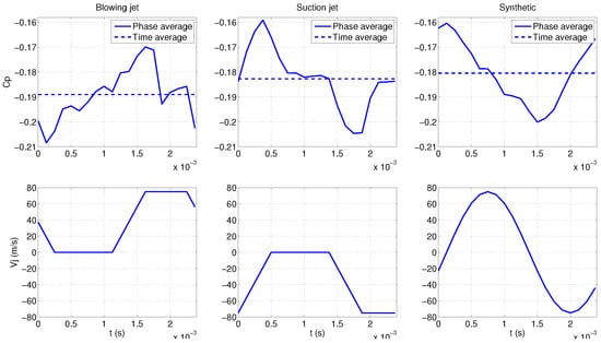Rear back spectral quantities are mainly governed by the actuator forcing frequency (Figure 30). However, pressure phase averaging, illustrated in Figure 31, displays significant specificities depending on the signal type. It is particularly sensitive to the jet velocity variations. Indeed, it evolves approximately in the same way as the jet flow oscillations especially with suction and synthetic jets.