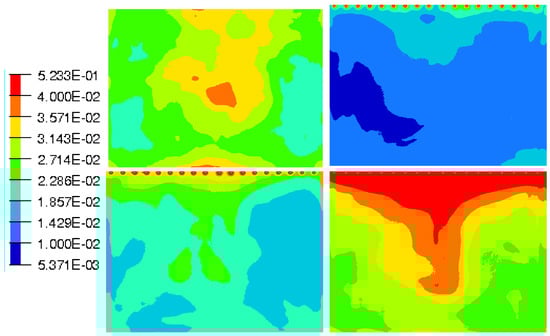 RMS values of pressure coefficient on the rear back end: reference case (Top left), pulsed jet (Top right), suction jet (Bottom left) and synthetic jet (Bottom right).