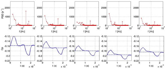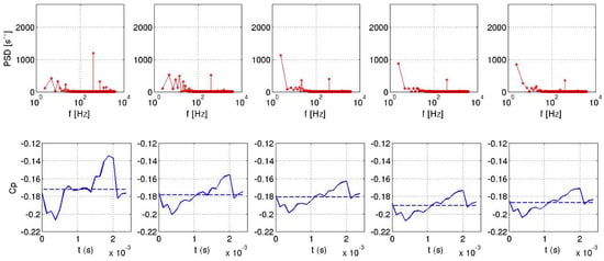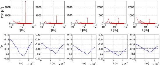 However, correlation between the jet velocity and the pressure coefficient for pulsed jet is only visible locally for the probe 1 located close to the roof edge slots (Figure 33). Indeed, the pulsed frequency is only visible for the probe 1 by the power spectral densities (PSD) illustrated in Figure 34. Figure 34 and Figure 35 illustrate that for the pulsed jet, pressure coefficient of the probe 1 evolves in a same way as the suction jet sensor. Other sensors are subjected to different pressure fluctuations that deteriorate the periodic pattern. For the suction jet simulation, all sensors behave in a same way similar to the integrated signal. Finally, all probes for the synthetic jet computation are sinusoidal signals in quadrature phase with respect to the jet signal as seen in Figure 36.