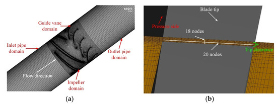 In this work, a hexahedral mesh is used to discretize the computational domain (as shown in Figure 2a). To obtain the detailed flow characteristics around the blade surface and tip clearance region, mesh refinement is adopted. As shown in Figure 2b, there are 20 nodes from the pressure side (PS) to the suction side (SS), and 18 nodes are arranged from the blade tip to the shroud. According to the independence test of mesh number, as shown in Table 2, when the number of whole passages increases to 3,583,423, there is limited influence on the pressure increment (Δp). Therefore, Mesh 3 with 3,583,423 elements is used in the present work, and detailed information is given in our previous work [17].