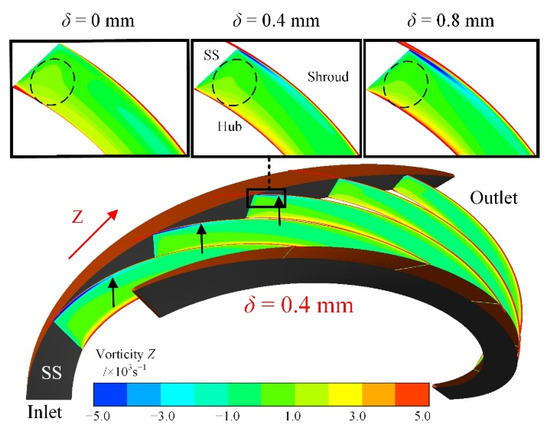 Figure 8 displays the vorticity Z on the meridional plane in the guide vane. Due to the extended structure of the guide vane, the separation vortex occurs near the hub and develops to the shroud along the streamwise direction. In Figure 6 and Figure 7, the tip leakage flow rate and leakage vortex intensity increase sharply at larger δ, together with higher flow loss. Therefore, the fluid kinetic energy and inertia force decrease in the guide vane inlet, and the vortex intensity weakens as the δ increases accordingly. In addition, the effect of wall friction leads to the vortex structure near the shroud, while the vortex rotation direction is different from the separation vortex near the shroud. Similarly, an increase in δ causes a weakened vortex strength, which is also related to the increased flow loss in the impeller.