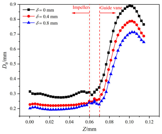 Figure 12 shows the variation in the average Db from the impeller inlet to the guide vane outlet for different tip clearance sizes. The variation shows the same trend for different conditions. In the impeller region, overall, the Db is nearly unchanged, while it shows a trend of sharp increase followed by a gradual decrease in the guide vane region. Figure 10 reveals that as more severe gas phase accumulation occurs in the guide vane, the rate of collision between the bubbles will increase, so the Db in the impeller region is significantly larger than that of impeller. In addition, the Db tends to decrease with increasing δ, which is also related to the decreased gas accumulation (Figure 10).