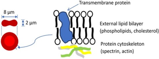 Blood constitutes about 8% of an average adult’s body weight and its role is to transport material to and from tissue, prevent fluid loss, and defend the body. Blood is a mixture of plasma, which makes up 55% of blood’s volume, and blood cells, which make up the remaining 45%. While plasma consists of water, proteins, inorganic salts, and organic substances, blood cells include white blood cells (leukocytes, WBCs), platelets, and red blood cells (erythrocytes, RBCs). The most abundant cells in vertebrate blood are RBCs. A human RBC is a nucleus-free cell with a lipid bilayer membrane over a protein cytoskeleton encapsulating a hemoglobin solution (Figure 1). Because of the fluidic nature of hemoglobin and the elastic nature of the RBC membrane, the RBC is capable of dramatic deformations and it exhibits rich dynamics, while the membrane surface area and volume remain constant [1,2,3].