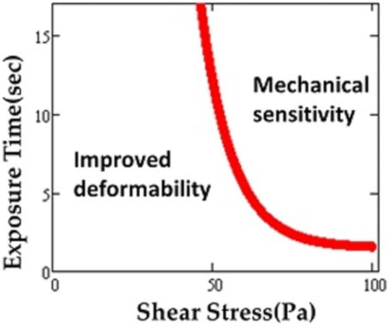 Although the highest value of shear stress in the human circulatory system reaches up to 15 Pa [29], MCS devices (e.g., artificial blood pumps) briefly expose RBCs to much higher levels, even up to 1000 Pa or more [30]. As a result of such supraphysiological shear stresses, the mechanical properties of RBCs may be altered and RBC deformability affected [31,32,33,34]. High speed rotors inside MCS devices create non-physiological shear stress (NPSS) during clinical applications [35]. It was found that maximum scalar shear stress can reach as high as 3000 Pa on blade tip regions of the impellers of the devices [36]. Exposure to short-term and repeated shear stress in circulation also leads to accumulated sublethal damage [10]. Simmonds defined mechanical sensitivity in order to characterize RBC susceptibility to shear stress [37]. This measure was used to map out tolerance of the red blood cell to shear stress in relation to deformability for exposure times ranging from 0–16 s and shear stresses of 0–100 Pa [38]. A plot depicting different regimes similar to the domains found for the thresholds for hemolysis (Figure 3) was produced.