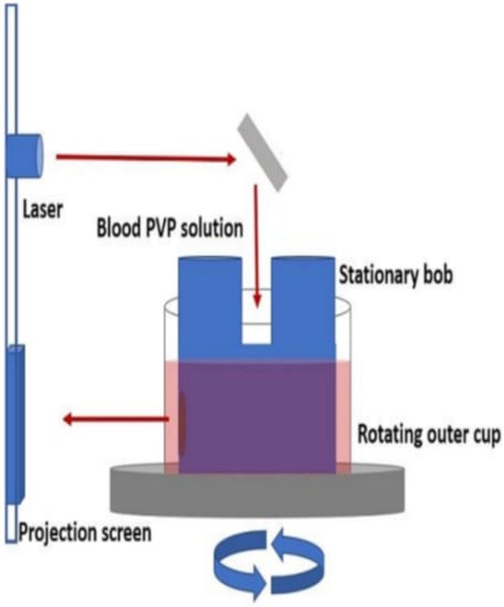 The most commonly used methods have been the ektacytometer (Figure 5) and filtration [59,60,61]. The ektacytometer employs a concentric cylinder geometry similar to a Couette cup-and-bob viscometer to deform the cell. When observed in a laminar flow field of the instrument, the red blood cell exhibits an ellipsoidal shape. Deformability is characterized by the aspect ratio (L/W) or more commonly by the deformation index, DI, also called the elongation index, EI, defined as EI = (L − W)/(L + W) where L is the length of the RBC major axis and W is the length of its minor axis. Light diffraction measurements yield the values of the EI in the ektacytometer and a scan as a function of shear rate can yield other parameters that characterize cell rigidity, such as the maximum EI, EImax.