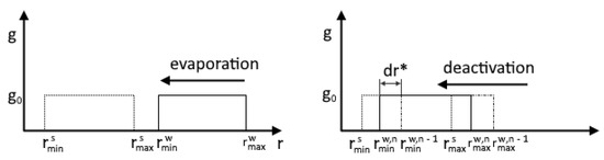 Evaporation occurs at . In this case and the droplet radius decreases. We assume that the deactivation of particles (their complete drying) begins when the droplet size reaches the initial values of the size of solid particles. Figure 3 illustrates the processes of evaporation and deactivation using the example of a uniform distribution of foreign particles.
