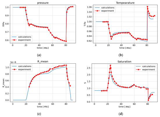 Comparison of experimental results [28] and calculations: (a) the pressure; (b) the temperature; (c) the average particle radius; (d) the saturation ratio.